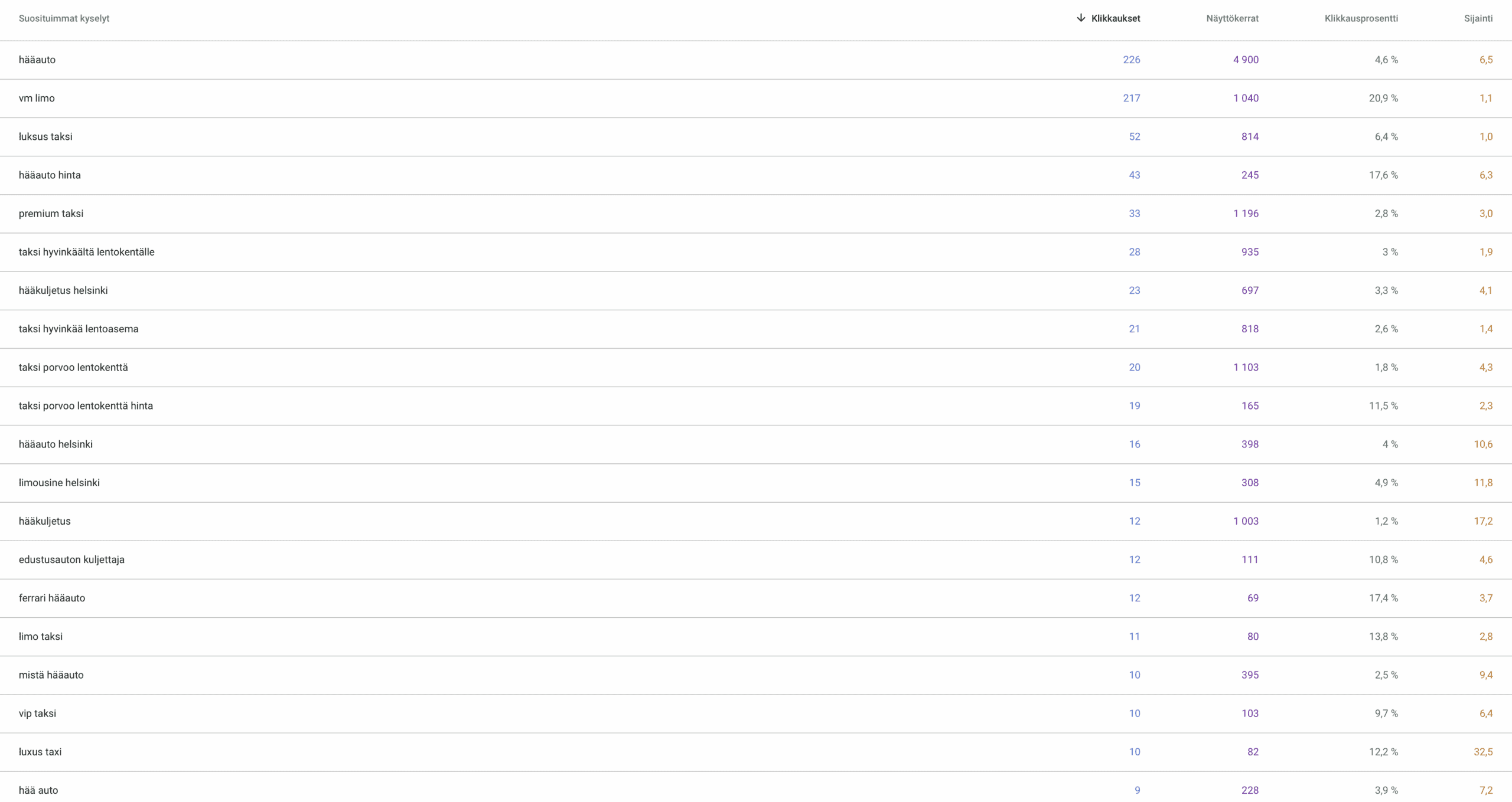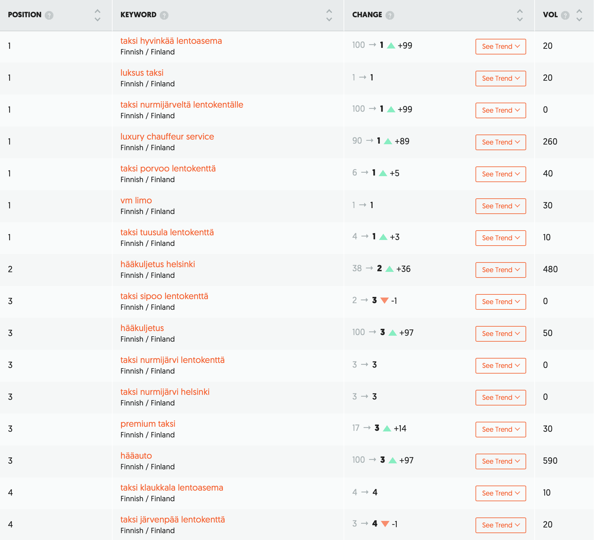 Noin kahden vuoden aikana sivusto on noussut kärkisijoille lentokenttäkuljetuksia koskevilla hakusanoilla, kuten “taksi Hyvinkäältä lentokentälle”, ja sijoittunut kolmen parhaan joukkoon useilla hääkuljetuksia kuvaavilla hauilla, kuten “hääkuljetus Helsinki” tai “hääauto”, mikä on vahvistanut asemaa edustusajopalveluiden tarjoajana.