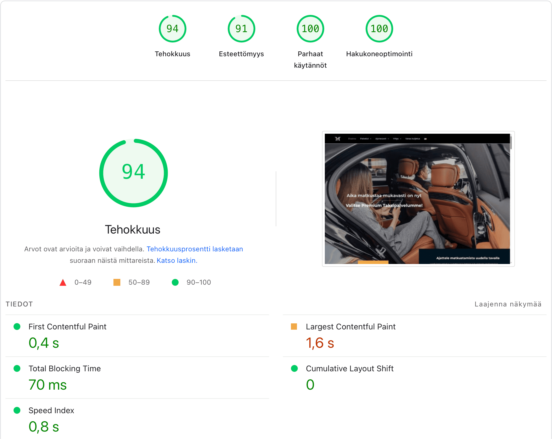 Nykyisin sivustolla vierailee noin 3 000 kävijää vuodessa Googlen orgaanisen liikenteen kautta, ja liikenne painottuu erityisesti ennakkotilattaviin taksipalveluihin, lentokenttäkuljetuksiin sekä edustusajoihin. Tulokset osoittavat, että selkeästi kohdennettu verkkosivusto yhdistettynä laadukkaaseen hakukoneoptimointiin voi tuoda merkittävää näkyvyyttä ja uusia asiakkaita ilman maksettua mainontaa.
